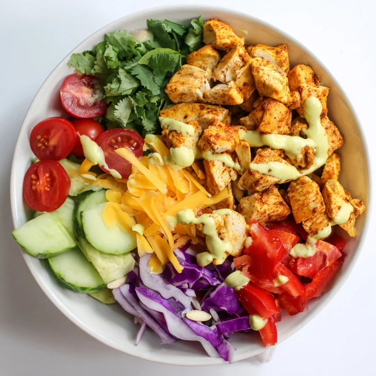 The assembly is flexible—arrange chopped romaine, crisp cucumber, sweet bell peppers, cherry tomatoes, and red cabbage as your base. Top with tender spiced chicken, ripe avocado slices, shredded cheese, and crunchy pumpkin seeds. Finish with fresh cilantro and lime wedges for brightness.