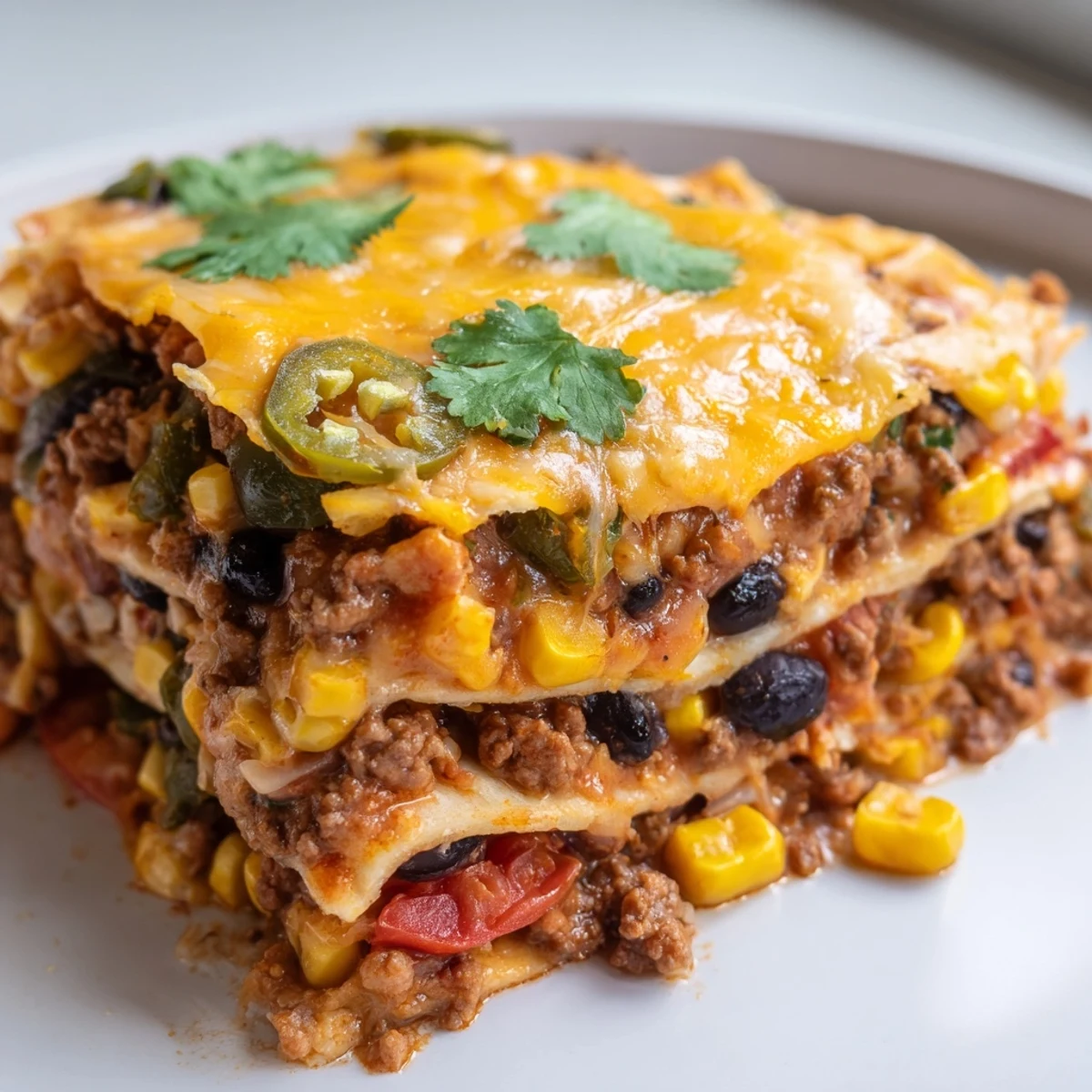 This Tex-Mex inspired casserole transforms traditional lasagna into something entirely new and exciting. Soft flour tortillas replace pasta, layered with a hearty mixture of seasoned ground beef, black beans, sweet corn, and diced tomatoes. The dish gets its authentic Mexican flair from taco seasoning and optional chili powder, while layers of shredded Mexican cheese blend create that irresistible gooey topping. After 35 minutes in the oven, the cheese turns golden and bubbly, while the tortillas absorb all those wonderful spices. Let it rest briefly before serving—the layers hold together beautifully for clean slices. Top with fresh cilantro, sliced jalapeños, or a dollop of sour cream to customize each serving. Perfect for feeding a crowd, this dish reheats beautifully and often tastes even better the next day.